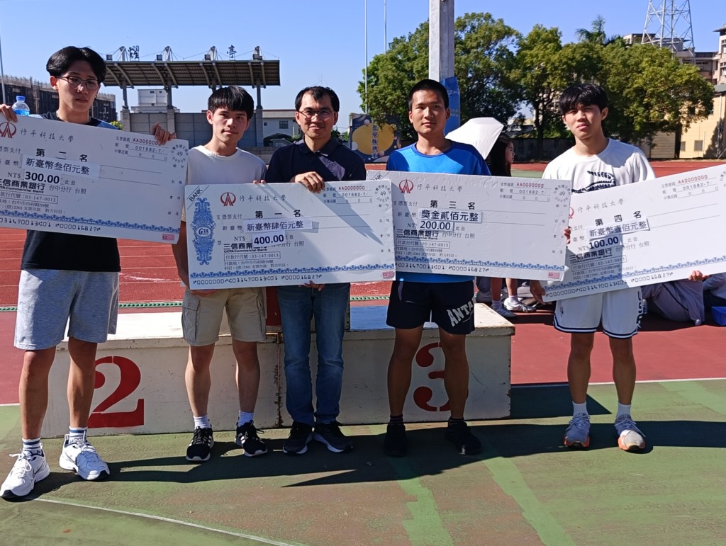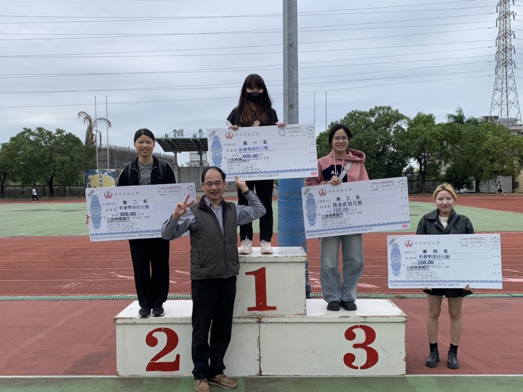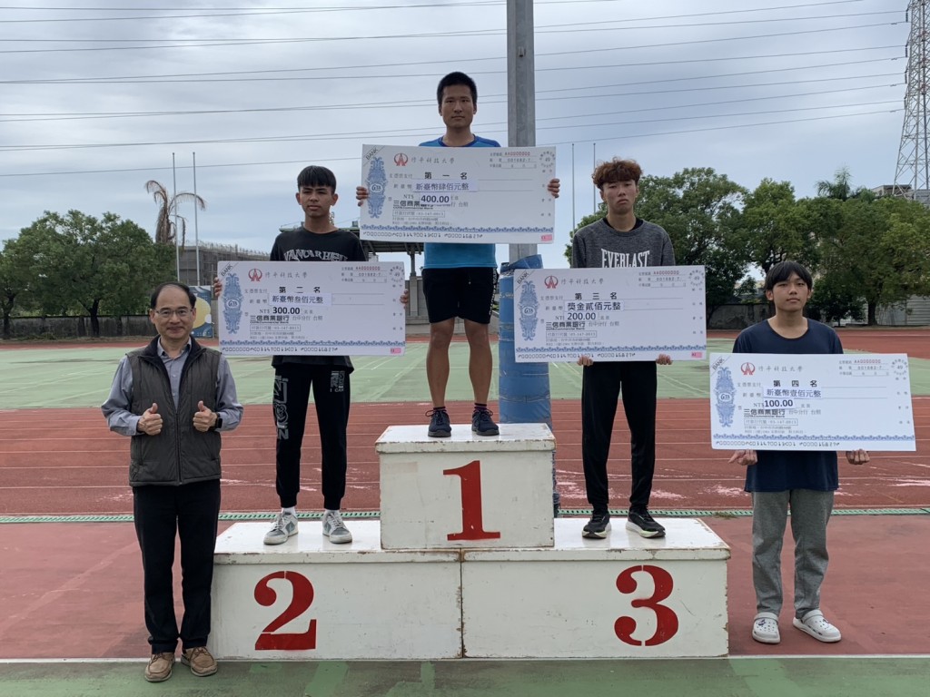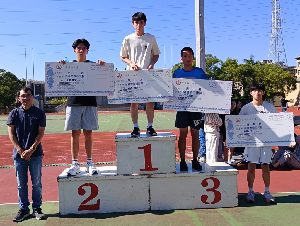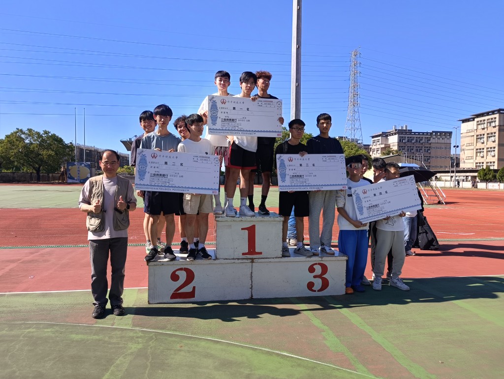 59週年校慶運動會 59週年校慶 田徑總錦標114.12.6 代表領獎名單 組別 第一名 第二名 第三名 男子組 觀餐系 (李淑美) 電機系 (謝承達) 企管系(人資) (林玉華) 女子組 觀餐系 (許名勝) 企管系 (黃玉菁) 資管系 (王仁澤) 回到活動花絮